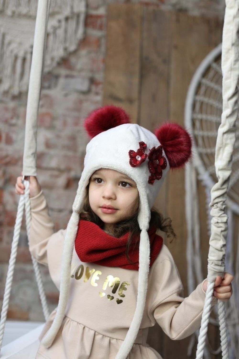 Czapka dziewczęca z pomponami, beżowa, Marika